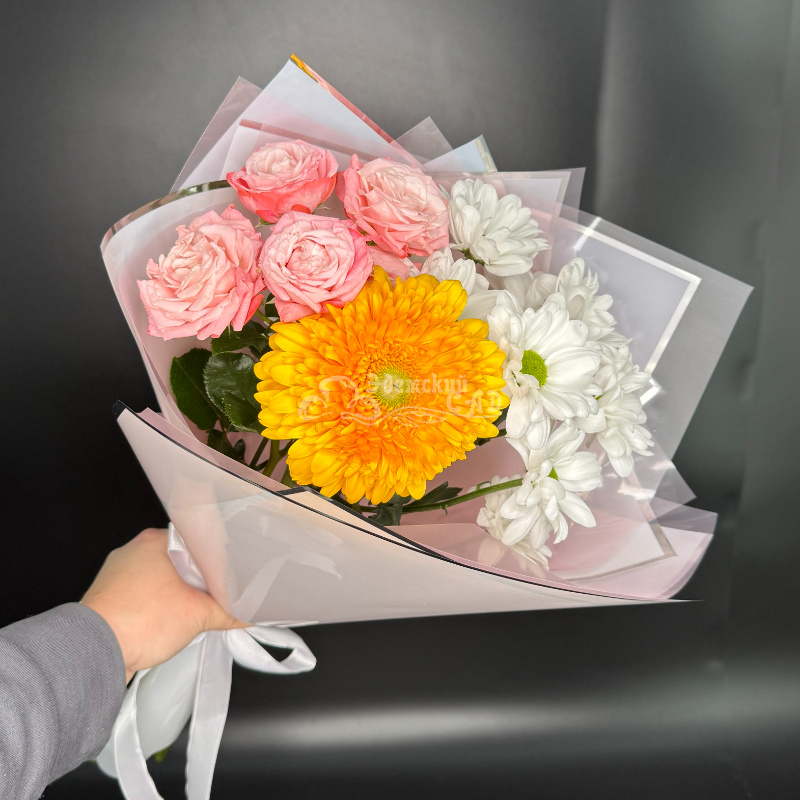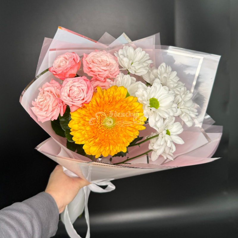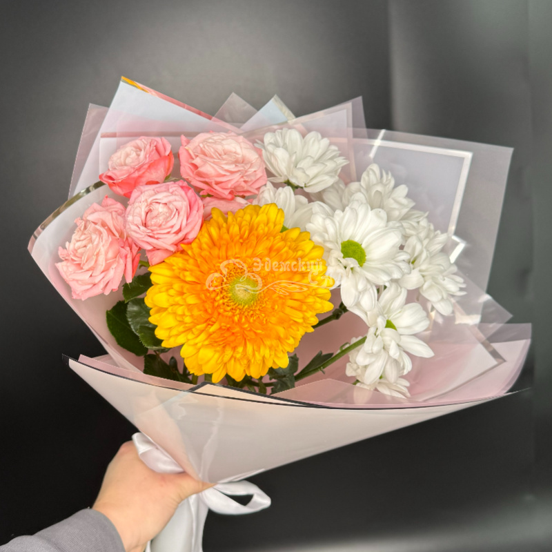 Букет не большой, но достойный внимания и также вызывает радость и хорошее настроение.