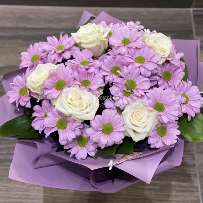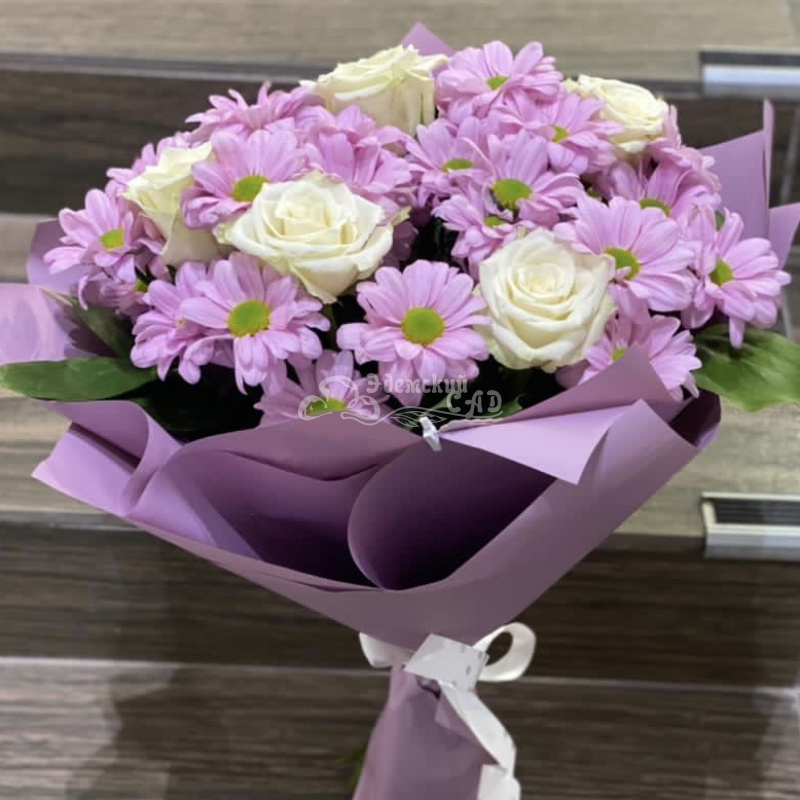 Зеленоглазые розовые хризантемы очаровательны среди белых чистых роз.